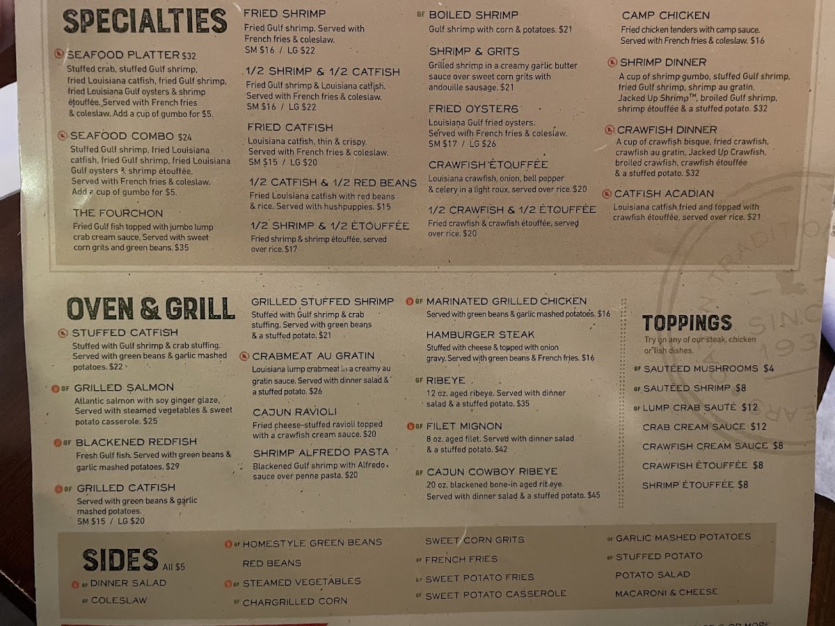 For those seeking something lighter, the Seafood Salad, featuring boiled Gulf shrimp, crawfish, and lump crabmeat, offers a delightful balance against garden greens for $20.50. The menu also boasts flavorful Topper options, including Sauteed Shrimp and Crab Cream Sauce, which elevate any dish.