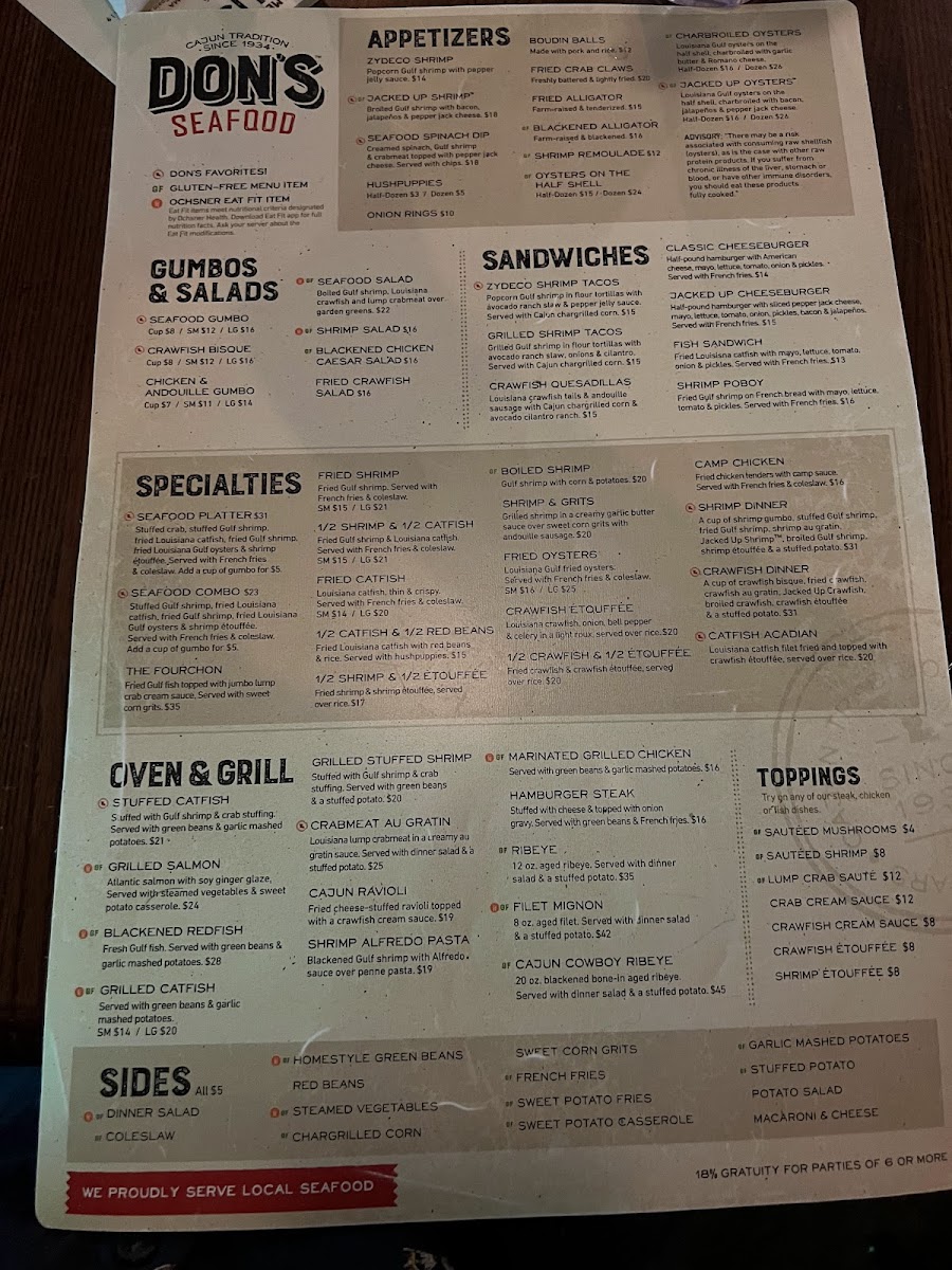 Couple your meal with satisfying sides like Sweet Potato Casserole or Garlic Mashed Potatoes, each for $5.25, and you're in for a memorable dining experience. Dons Seafood is not just a meal; it’s a taste of Louisiana’s vibrant seafood legacy.